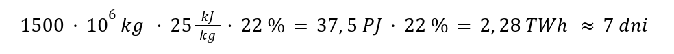 Możemy oszacować na jak długo starczyłaby rezerwa od pokrycia zapotrzebowania całego państwa. Przyjmiemy wartość opałową węgla jako 25 kJ/kg i łączną sprawność wytwarzania i przesyłu energii elektrycznej na 22 %. Dzienne zużycie energii elektrycznej na skalę całego kraju to ok. 0,3 TWh, zatem: